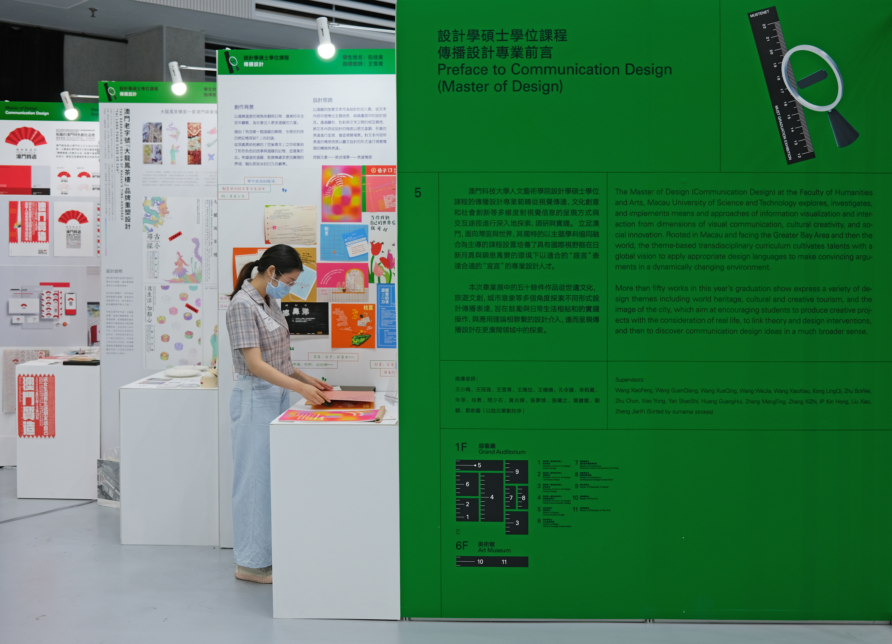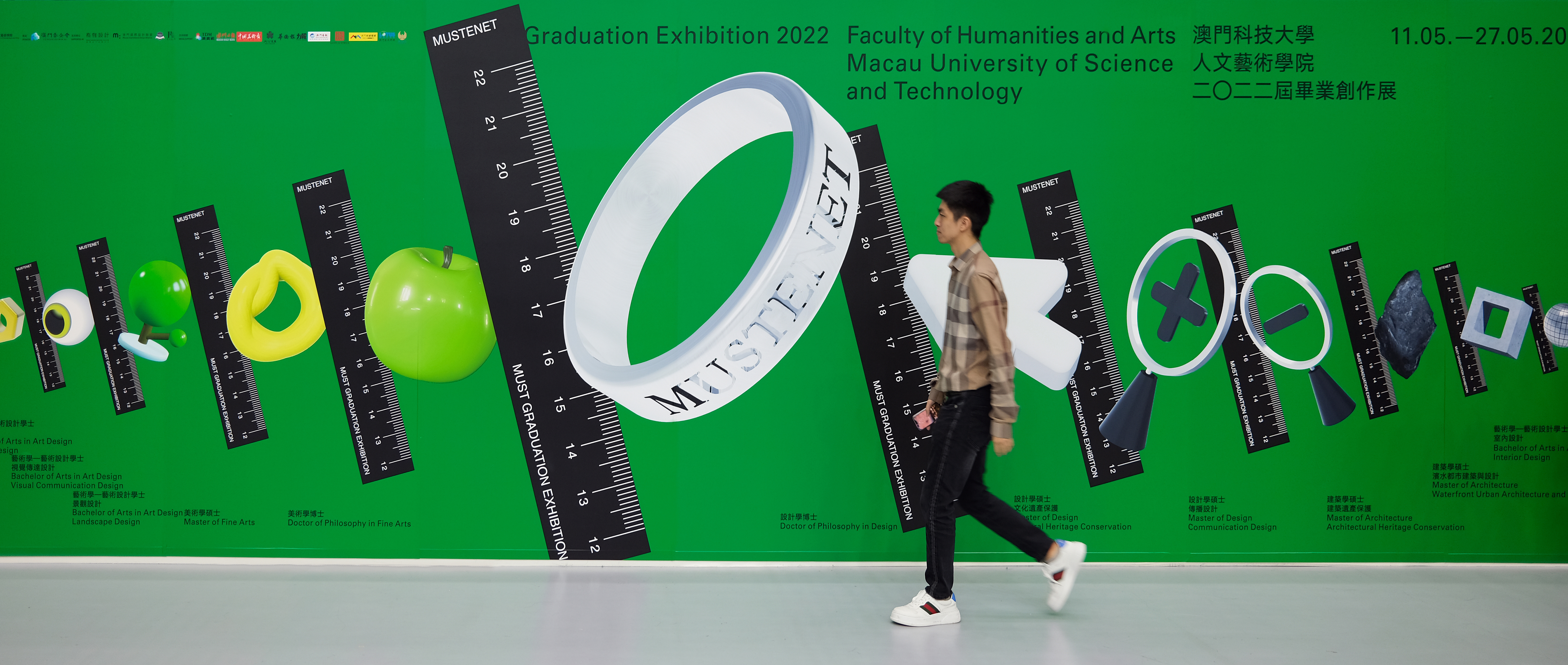 Macau Unversity of Science and Technology has held the graduation exhibition for a decade. The main visual identity of 2022 uses a ruler to record the exhibition history. The ring means the vows of education. The ruler and the ring combine to be the figure "10". The secondary identity uses eleven icons to point to the eleven majors.