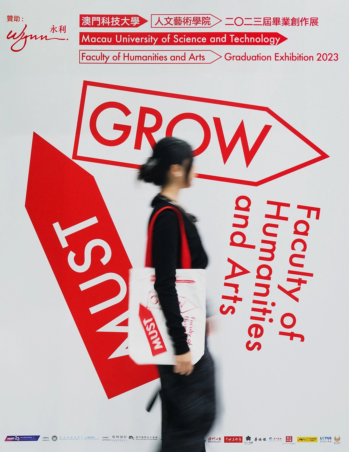 MUST GROW is the theme of the 2023 Graduation Exhibition of the Faculty of Humanities and Arts of Macau University of Science and Technology. "Grow" is a process of movement, with direction, speed and uncertainty. We use the name of degree programmes to reflect the student's professions. The visual element use a large number of arrows with strong direction and variety to show the strength of facing to the challenges.